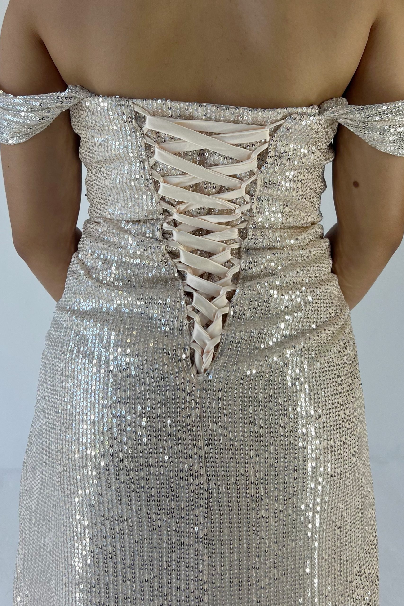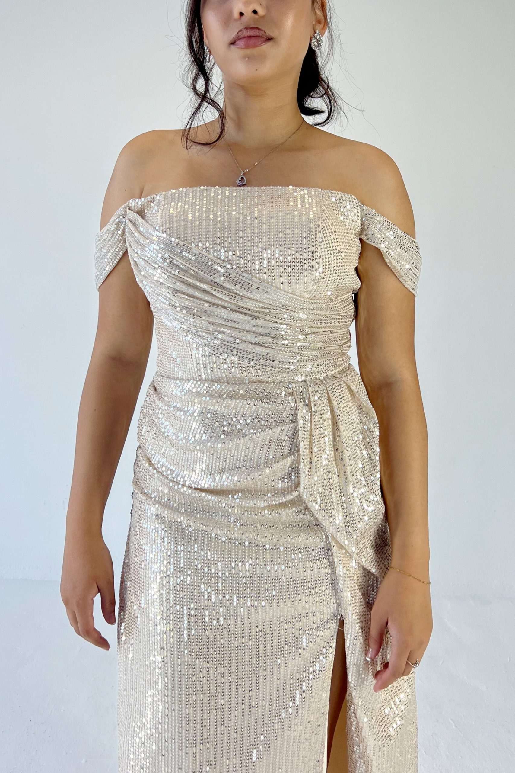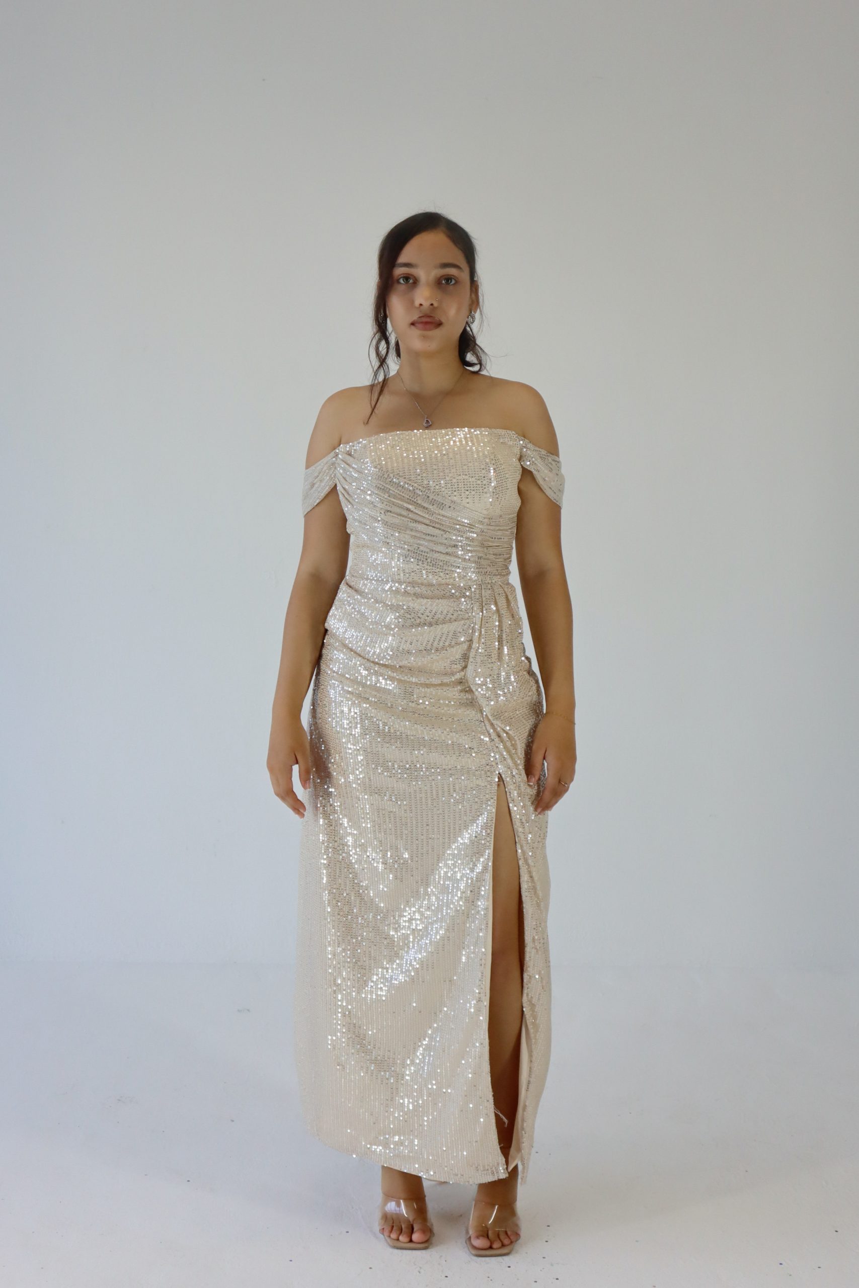 Turn heads at prom in this sparkling off-shoulder champagne sequin dress! With its flattering body-hugging fit,  and thigh-high slit, it’s the perfect mix of glam and confidence. Shine bright and make every moment Insta-worthy in this must-have prom look! Beautiful sequence, a corset back gives this dress a stretch, this makes sizes flexible.