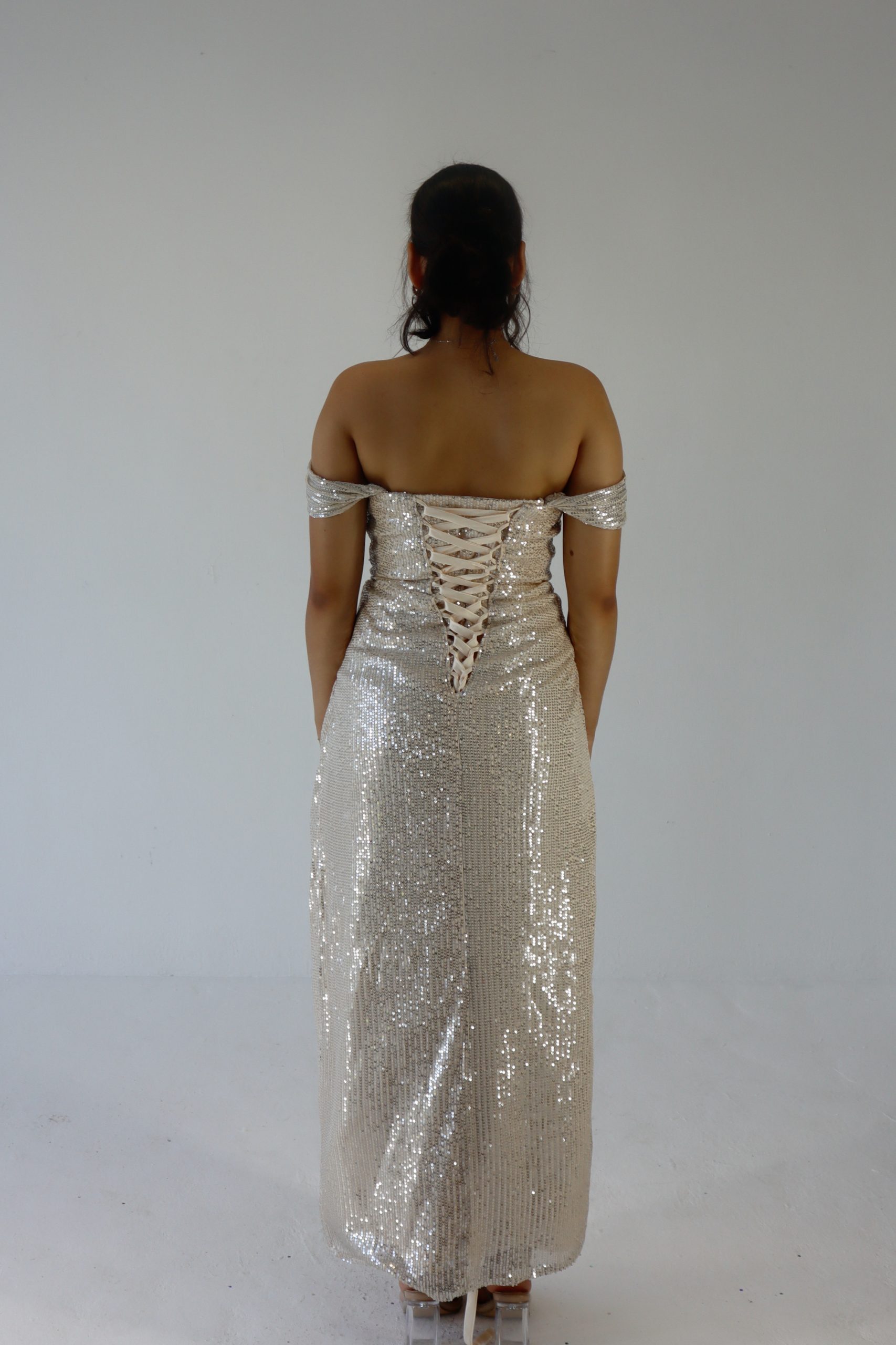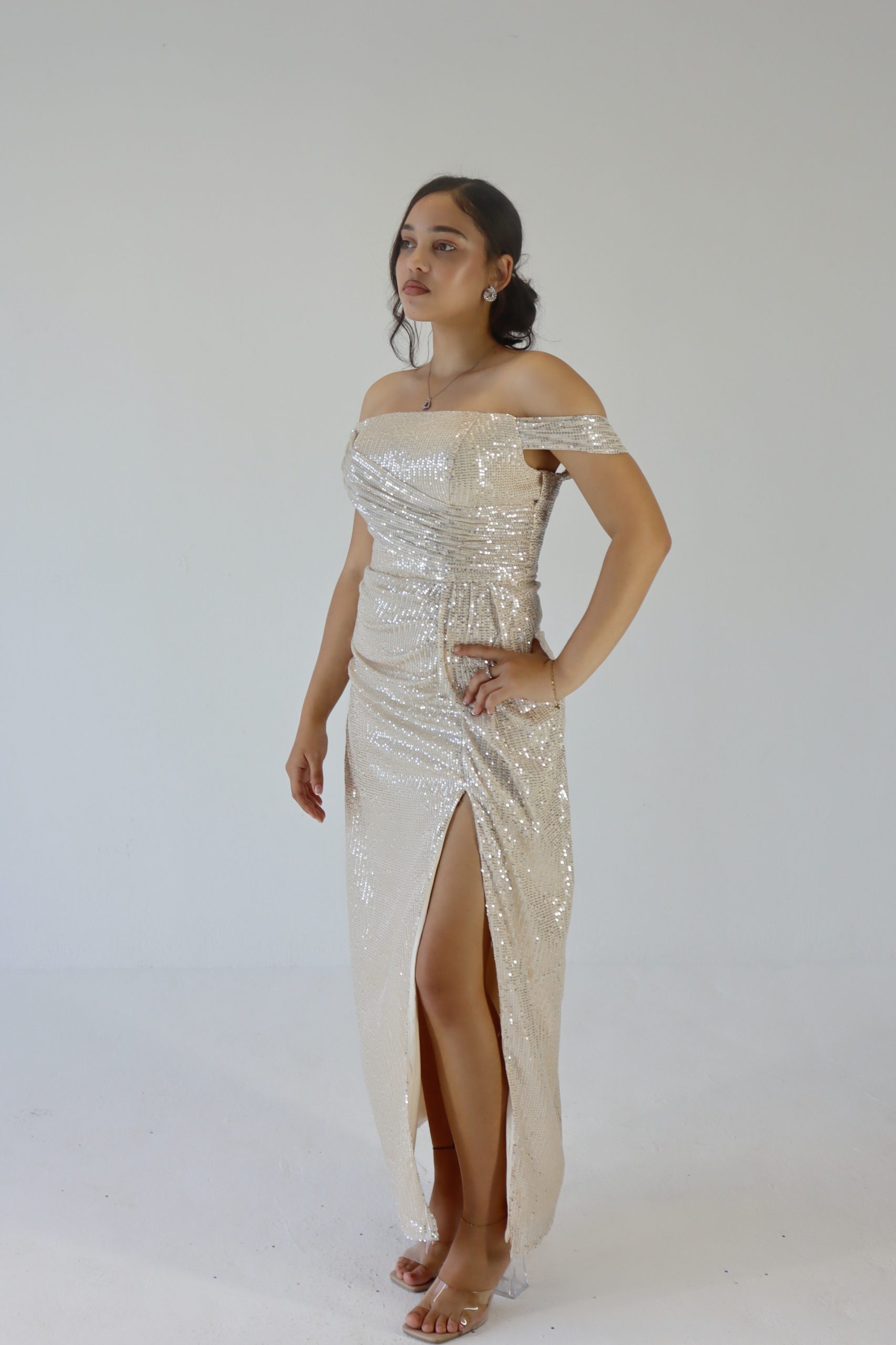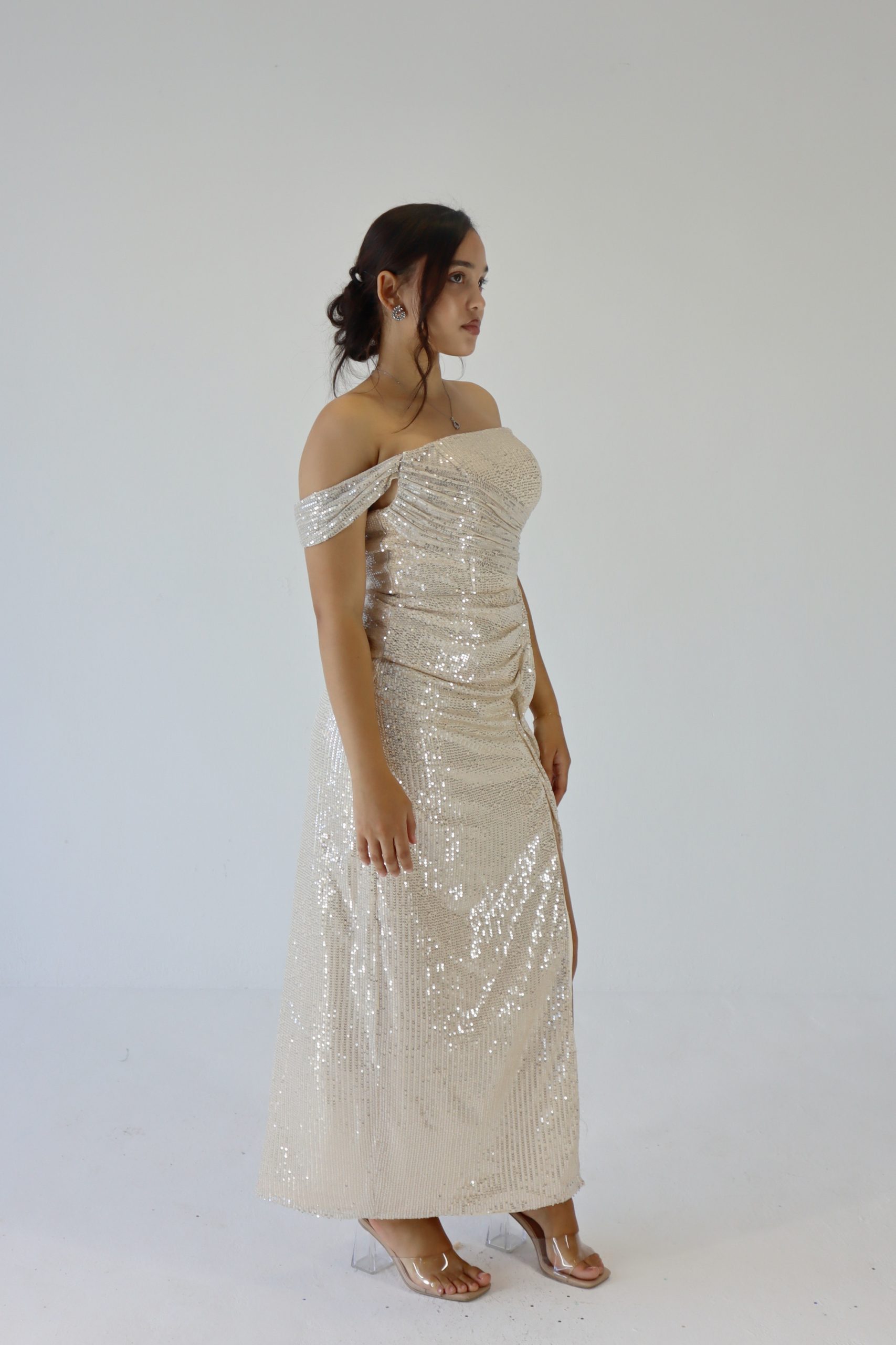 Turn heads at prom in this sparkling off-shoulder champagne sequin dress! With its flattering body-hugging fit,  and thigh-high slit, it’s the perfect mix of glam and confidence. Shine bright and make every moment Insta-worthy in this must-have prom look! Beautiful sequence, a corset back gives this dress a stretch, this makes sizes flexible.